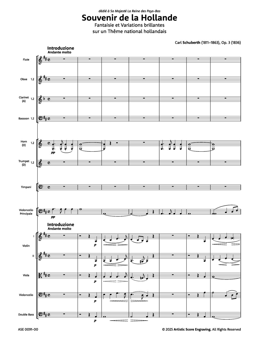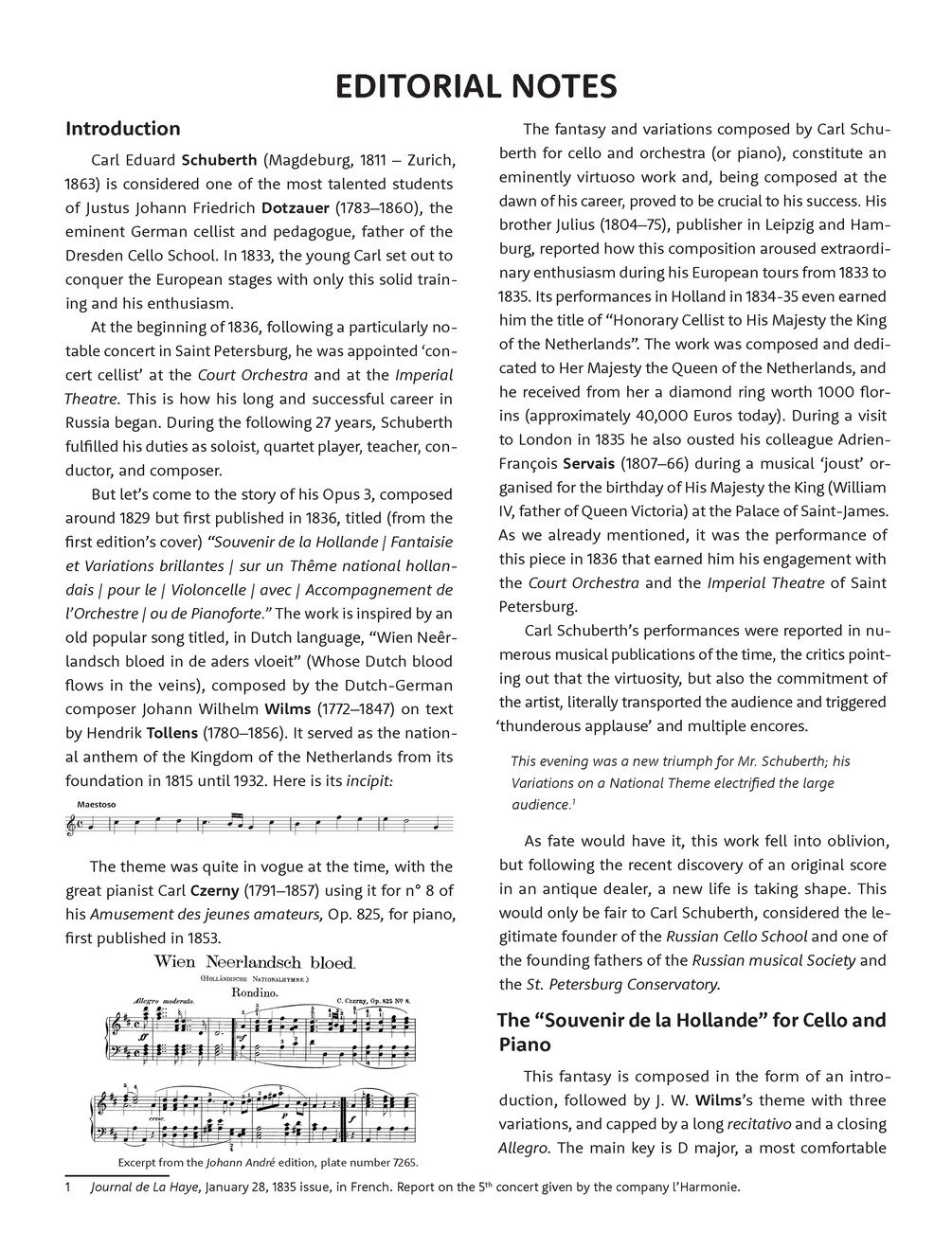 His Opus 3, composed around 1829 but first published in 1836, titled “Souvenir de la Hollande | Fantasie et Variations brillantes | sur un Thême national hollandais | pour le | Violoncelle | avec | Accompagnement de l’Orchestre | ou de Pianoforte.” is inspired by an old popular song titled, in Dutch language, “Wien Neêrlandsch bloed in de aders vloeit” (Whose Dutch blood flows in the veins), composed by the Dutch-German composer Johann Wilhelm Wilms (1772–1847) on text by Hendrik Tollens (1780–1856). It served as the national anthem of the Kingdom of the Netherlands from its foundation in 1815 until 1932.