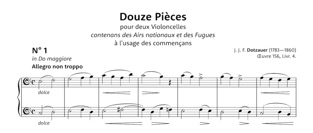 Each book contains a version faithful to the original text by Dotzauer, then at least two more versions. One with my personal fingering and bowing suggestions, and at least one (according to original availability) of the versions by Carl Hüllweck, Johannes Klingenberg, and Alwin Schroeder.