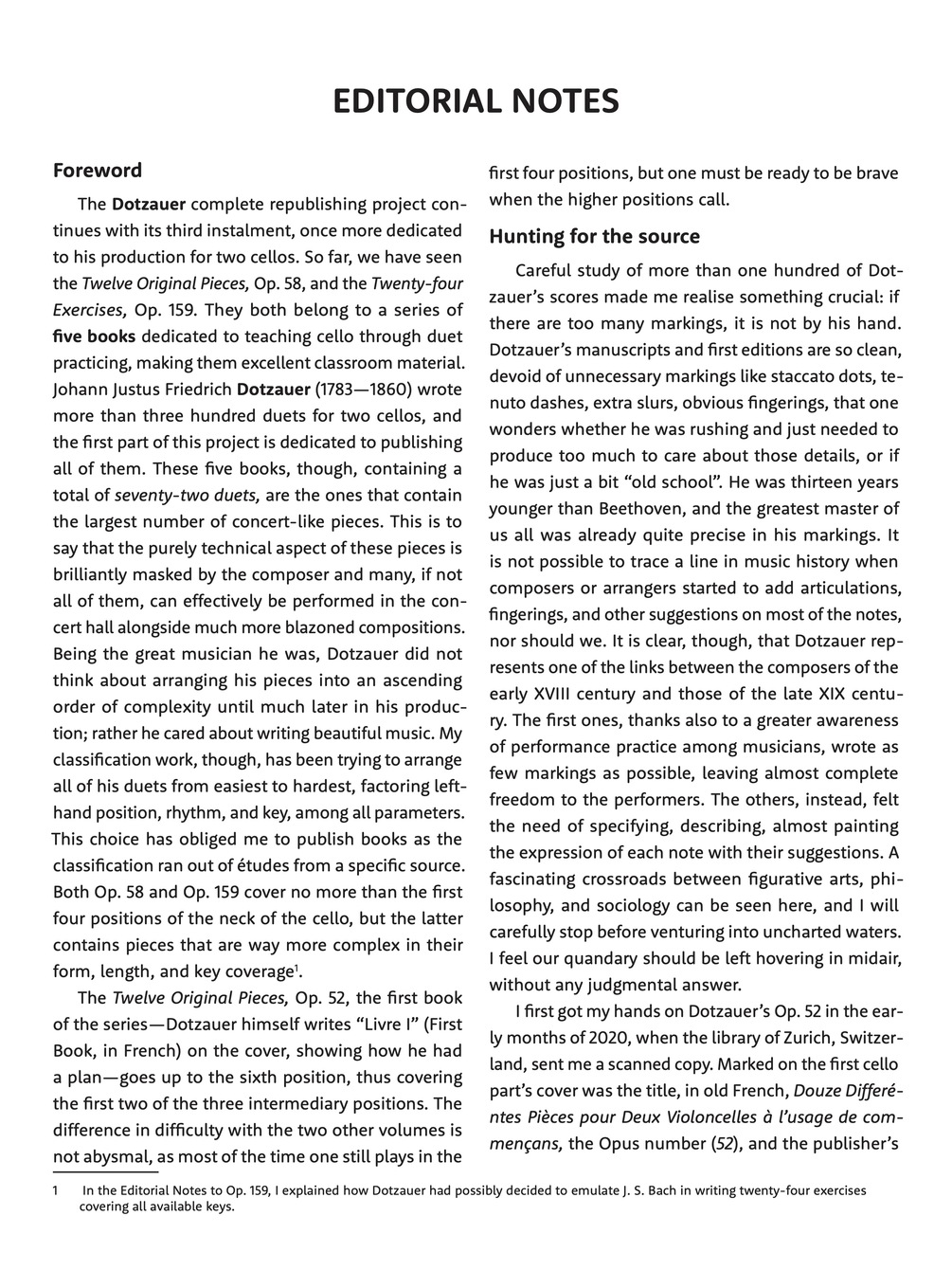 This edition is offered in two versions, Basic & Collector’s Edition. The Basic version can be purchased in either of the following variants: score only, parts only, score and parts. It is based on the first edition published by Dotzauer at Breitkopf & Härtel in the 1820s. The Collector’s Edition adds the version of these pieces as it appears in the 57 Little Duets compiled by Johannes Klingenberg (1852—1905), and published at the end of the XIX century.