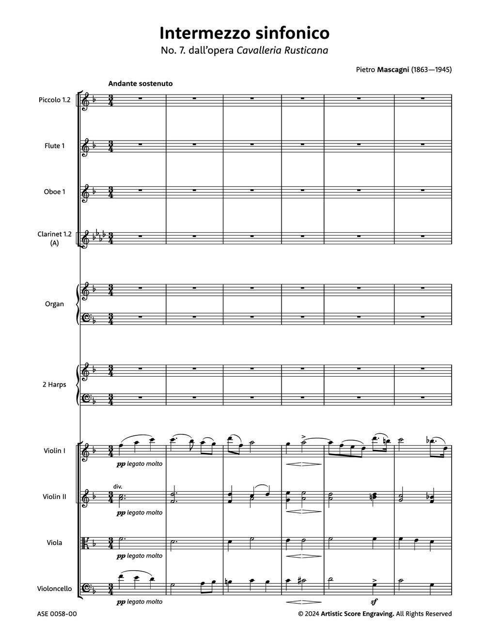 Pietro Mascagni’s (1863—1945) Intermezzo Sinfonico from his opera Cavalleria Rusticana needs no presentation. The idea of this edition comes from an update to an arrangement created for a friend’s wedding in 2010. While arranging, I stumbled upon the composer’s autograph of this Intermezzo, for piano solo, and decided to add a modern engraving of it to the mix. Finally, an orchestral score and a full set of parts have been included to close the circle.