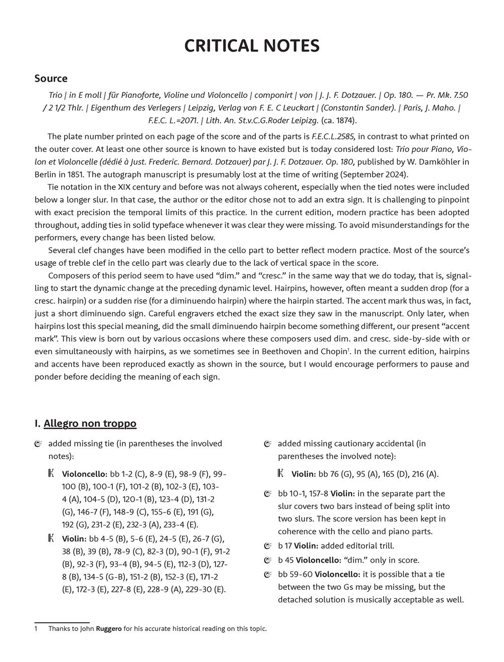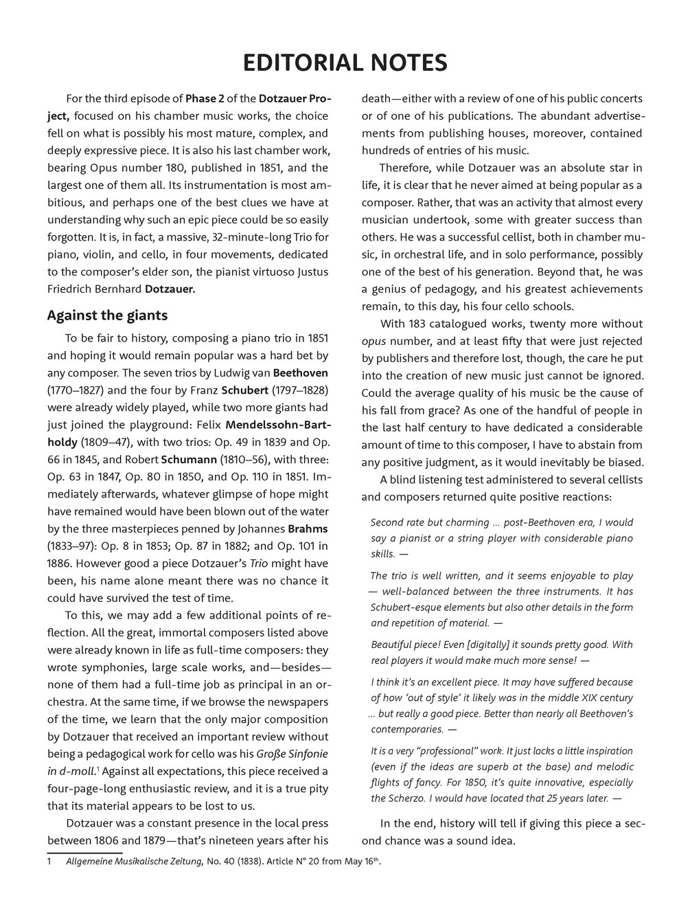 This edition represents the first modern publication of the Trio, and includes a detailed introduction and analysis alongside Critical Notes that list all editorial choices. The separate string parts include the original bowing and fingering suggestions by Dotzauer.